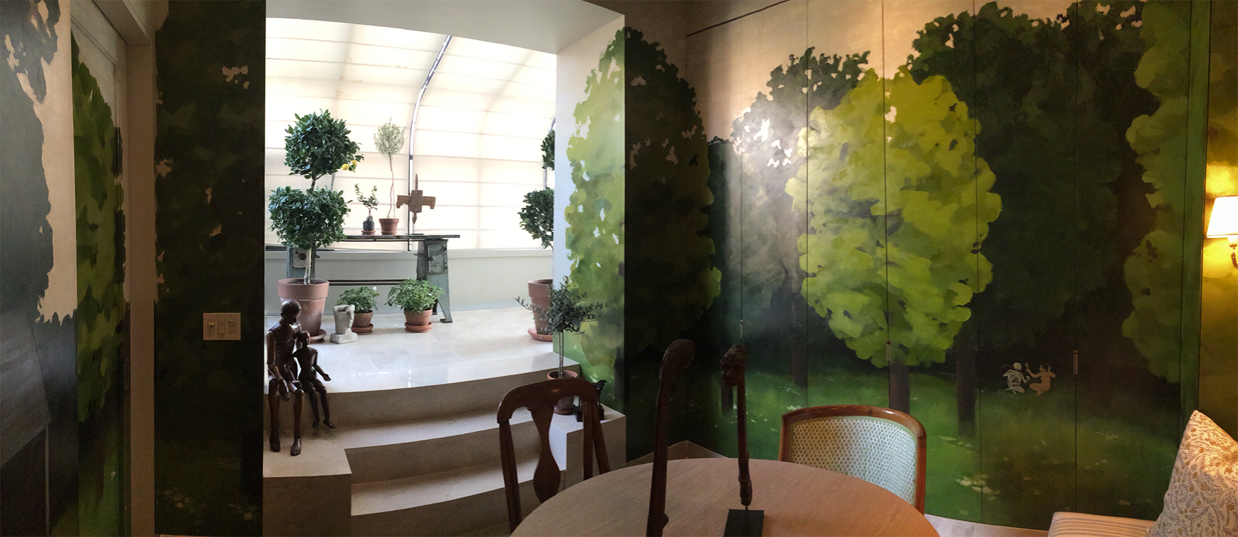 A hand-painted mural designed to wrap the architecture of a Manhattan penthouse, creating a room that feels like stepping into a painting.