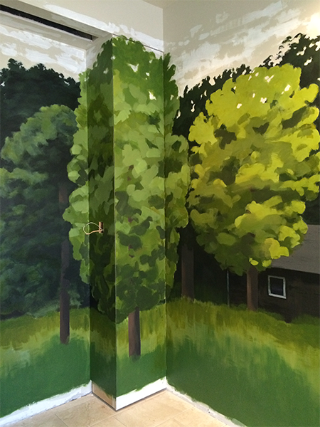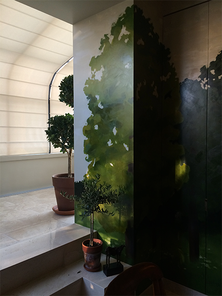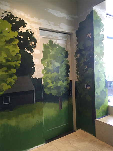 The mural was planned digitally so the landscape could continue seamlessly across the door.