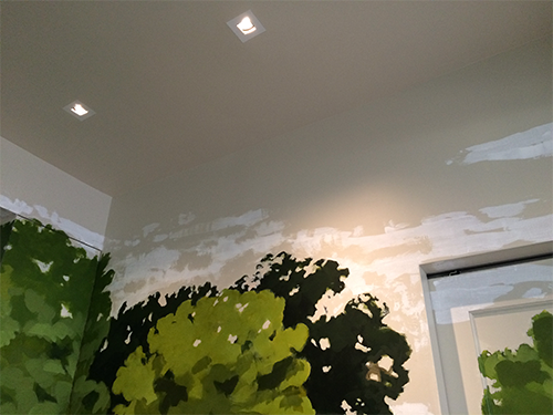 - At the top of the walls, a painted sky softens into the neutral ceiling color, allowing the scene to feel open rather than contained.